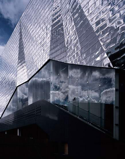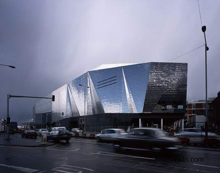這是FOA的一個(gè)較新的商業(yè)中心建筑,位于英國(guó)的萊斯特市。建筑包括一家John Lewis的分店以及在同一大樓內(nèi)的一家電影院,電影院有一個(gè)封閉的外殼,表皮使用的是起皺的不銹鋼貼面,如同劇場(chǎng)的幕布,同時(shí)豐富的光線(xiàn)反射讓其熠熠生輝。相鄰的則是輕盈透明的John Lewis店,多層的蕾絲花邊讓其看起來(lái)如同網(wǎng)格窗簾。