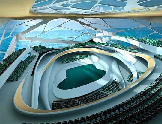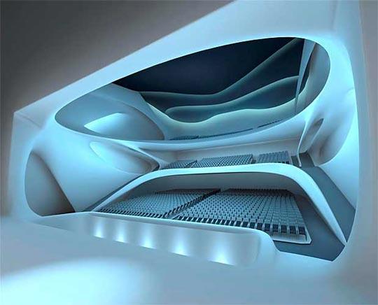 這是哈迪德設計的表演藝術中心內的表演廳景觀圖,它讓人想起被鋸斷的動物骨頭形狀。