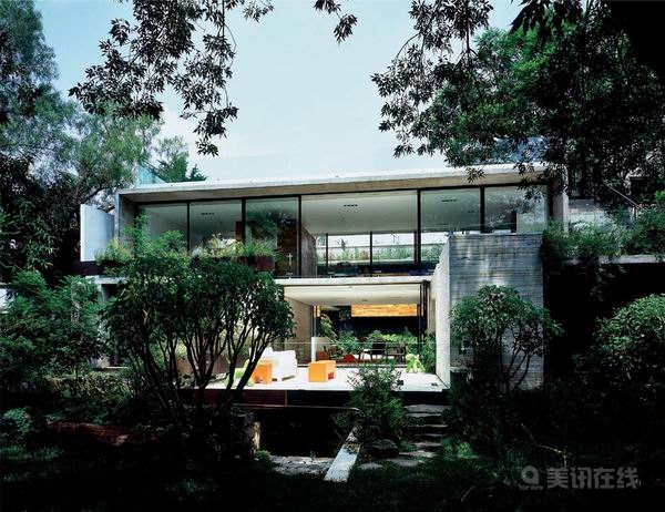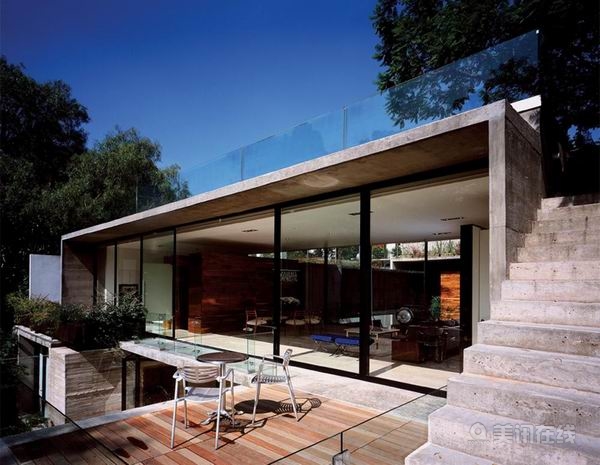 Amatepec橋樓室計(jì)劃將建于墨西哥市的一處居民區(qū),其基本設(shè)計(jì)方案是將一個(gè)簡單的開方式混凝土“盒子”置于兩塊豎直放置的大石頭上。這三種基本元素構(gòu)成了一個(gè)“H”形,而這個(gè)水平的“混凝土盒子”即Amatepec橋樓室便可作為通行橋。同時(shí)H形的結(jié)構(gòu)還創(chuàng)造了兩個(gè)院子:一個(gè)被停車場包圍著,而另外一個(gè)則開口面向花園。兩個(gè)院子靠“家庭活動室”進(jìn)行連接,使得玻璃窗既可以與外界保持聯(lián)系,又可以隨時(shí)斷開聯(lián)系。 要想進(jìn)入這所房子必須要經(jīng)過一個(gè)橫跨于第一個(gè)院子之上10米的混凝土通行橋,這也算是房子的一部分了,包括客廳、餐廳以及廚房。這個(gè)混凝土盒子在比較長的一面墻上,通過后施壓的方法打開了一個(gè)長16米的開口。而如果要進(jìn)入更為私密的區(qū)域――石頭平臺,則必須要沿著一個(gè)木樓梯走下來,這個(gè)石頭平臺起著“家庭活動室”的作用,位于混凝土盒子的正下方,在地下一層處還設(shè)有一個(gè)圖書館。