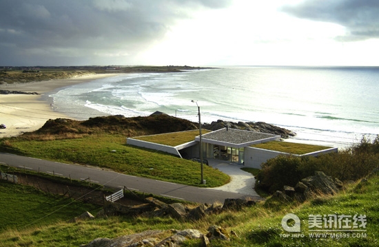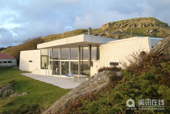 建筑單位:Jarmund/Vigsnæs AS Architects MNAL 地點(diǎn):斯塔萬格,挪威 建筑類型:私人住宅 建筑年份:2004 建成面積:260平米 這棟別墅好像是雕刻在地形之中,俯視著大西洋。即使在別墅后面的公路上也能欣賞一覽無余地觀賞海景,同時(shí)還能保護(hù)別墅不被風(fēng)吹。臥室面對(duì)著受自然保護(hù)的戶外空間,并且能夠讓人欣賞到近景。起居室則面對(duì)著地平線。別墅墻壁的兩面都灌有白色混凝土。 總體而言,使用的建筑材料采都和場(chǎng)地環(huán)境有關(guān): 混凝土中摻雜著海灘上的白沙,屋頂覆蓋著的草皮和鵝卵石來自附近的河流。室內(nèi),大部分混凝土表面并未進(jìn)行裝飾,少部分混凝土表面鋪有涂白的橡木、鋁板、劍麻地毯或綠松石瓦片。 防雨板和窗架鋁片漫射出來的陽(yáng)光看起來就好像是海上薄霧。