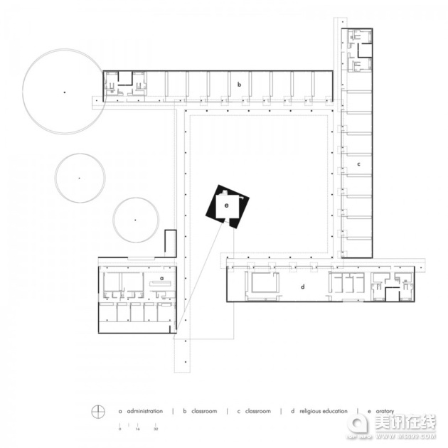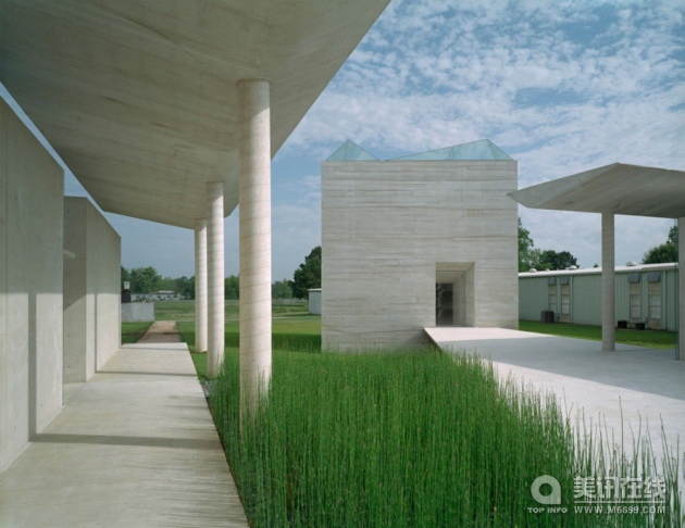 建筑設(shè)計(jì):Trahan Architects,亞太地區(qū) ![]() 圣玫瑰教堂的設(shè)計(jì)包括禮拜堂、管理樓和宗教教學(xué)樓,宗教教育主要面向路易斯安那州南部一個(gè)村莊教區(qū)的人民。由于建筑的宗教特殊性,設(shè)計(jì)者對(duì)建筑設(shè)計(jì)進(jìn)行了充分的研究,包括建筑形式、功能、燈光和材料等等各個(gè)方面。圣玫瑰教堂既不奢華,也不寒酸,它充分考慮了宗教神圣之地的特征,它的空間結(jié)構(gòu)能體現(xiàn)出此處的宗教精神。 ![]() 宗教教學(xué)區(qū)的總體規(guī)劃所營(yíng)造出來的建筑風(fēng)格和普通建筑完全不同,既包含了宗教的精神特征,同時(shí)也具有塵世的特征。宗教教學(xué)區(qū)的塵世元素體現(xiàn)在線性的建筑上:管理樓、兩個(gè)線性教室和一個(gè)宗教教學(xué)樓。這些線性建筑圍繞在中央庭院四周,而禮拜堂就座落在中央庭院里。 建筑使用的主要材料有現(xiàn)場(chǎng)灌澆的混凝土、厚玻璃板和壓鑄玻璃。為了營(yíng)造出一種冥思的氛圍,建筑師非常地注重空間結(jié)構(gòu),以及燈光和建筑材料的共同作用。 ![]() 禮拜堂的設(shè)計(jì)理念是一個(gè)孕育精神,純潔,神圣的地方。禮拜堂是一個(gè)正方體結(jié)構(gòu),6個(gè)面的大小、顏色和紋理全都相等。這樣的設(shè)計(jì)能讓內(nèi)部空間感覺起來像是一個(gè)被包圍保護(hù)起來的神秘之地。 自然光通過墻壁上各個(gè)開口照入室內(nèi)。此外,室內(nèi)暗淡的燈光設(shè)計(jì)象征著耶穌復(fù)活的神秘感,給為里面的人們指引方向。