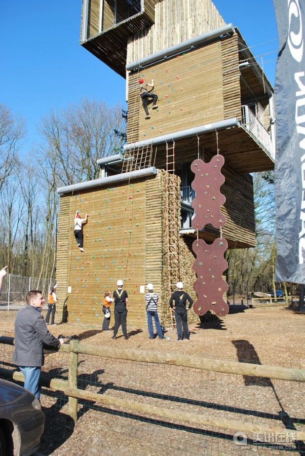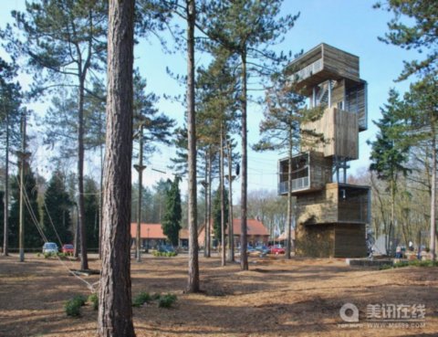 ![]() 建筑設計:Ateliereenarchitecten,荷蘭 ![]() 在荷蘭,大約有50多處地方被標記在地圖上,這些標記的地點都是非常適合野外休閑運動的地方。人們喜歡在這些地方徒步旅行,或者騎自行車,或者騎馬。盧索爾小鎮的商人們則尋思在當地建造一個戶外運動公園。 公園內這座觀景塔有25米高,配有攀爬和滑繩設備。觀景塔由六個立方體單元組成,懸掛在中間的鋼柱上。塔內或者塔的表層上裝有垂直的攀爬樓梯,而且都處在每一層的不同位置上。 其中有兩個立方體單元是可直接到達的。第三層的立方體單元平臺上裝有滑繩設備。在最高層的立方體單元中,人們可以欣賞到周圍的風景,同時這里也是繞繩下降的起點。附近有一家小餐館,在餐館內可以看到攀爬運動中的人們。 觀景塔使用的木頭來自附近的經濟林。 爬這座觀景塔的樓梯會給人帶來新奇的感受,因為這里有特殊的樓梯位置和立方體單元結構。木質材料的使用,讓觀景塔和周圍環境融為一體;而建筑奇特的外形也挺惹人注目的。 ![]() ![]()