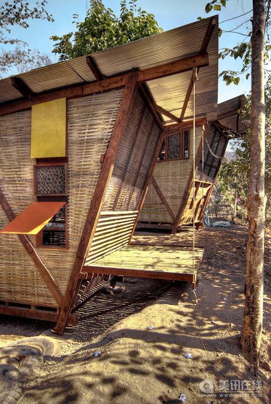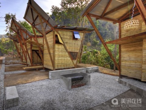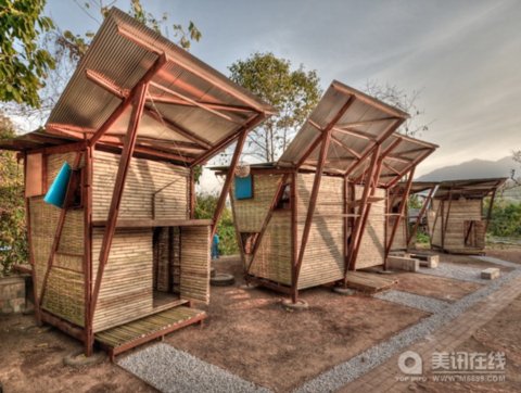 竹木,這些竹木按照傳統的編織方法構成房屋的主要結構。這些房屋能在現場組裝好。為了避免過度潮濕而帶來的腐蝕問題,房屋建造在四個輪胎基腳上,和地面保持一定距離。