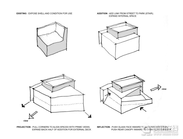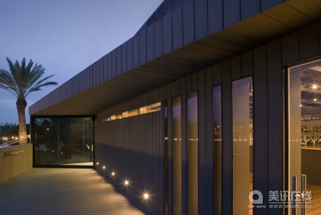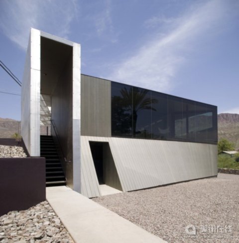 建筑設計:Blank Studio 社會容器項目位于美國亞利桑那州蘇必略鎮的Superstition山脈腳下,位于著名的Main Street和女王溪(Queen Creek)之間。這個項目從1882年開始修建,同周圍的銅礦,銀礦和金礦開采有著很強的聯系。這一地點有兩片區域,一處是朝南的項目所在地,另一處是開放的風景區,這片風景區將會開發成戶外用餐地。 ![]() 這個項目是對現有的一個兩層樓建筑進行翻新并且擴建,并增建一個戶外用餐平臺。一層中修建廚房,機械室和儲藏室,二層設計成一個開放的聚會場所。現有建筑的二樓朝南的墻壁被移除,內部空間被顯露出來。剩下的結構同周圍山脈的陰影相協調,并作為新的戶外用餐平臺的背景和基礎。 項目的靈感來源于“公共房屋”的概念。傳統的公共房屋是一個陰暗的,封閉的住宅。相反地,社會容器的建造目的是形成一個社區的起居室,一個集會,社交,觀賞地區藝術家的作品,以及欣賞周圍令人驚嘆的景觀的地方。 ![]() 項目的建造使用了冷色調材料。設計者在一樓處設計了一個通道,訪客可以穿過通道找到通往塔樓的樓梯,這個樓梯會將訪客帶入主樓入口處。一樓的外層使用了鋁制墻壁。塔樓同樣使用了鋁制材料的墻壁。在主樓入口處,訪客可以欣賞到廣闊的女王溪的風景,同時也可以看到旋轉的樓梯,木橋。然后,訪客圍繞著這個旋轉式的道路,穿過一個大的玻璃墻來到用餐平臺,在用餐平臺上,女王溪的全景和遠處Apache Leap巖石的形狀一覽無遺。 建筑的外觀作為項目的新的框架依附于這個地點之上。新的用餐平臺使用了木制板材建成,平臺東北面是雙曲線形。 ![]()