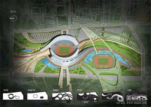 Populous(原HOK體育設(shè)計(jì)公司)贏得了斥資400億美元的仁川2014亞運(yùn)會(huì)主體育場(chǎng)的建筑設(shè)計(jì),這是Populous在韓國(guó)首次獲得的大型設(shè)計(jì)項(xiàng)目。該公司曾設(shè)計(jì)過布里斯班Suncorp體育場(chǎng)、約紐Yankees體育場(chǎng)以及2012年倫敦奧運(yùn)會(huì)主體育場(chǎng)的設(shè)計(jì)。 這座具有70000個(gè)座位的混合用途體育場(chǎng),在亞運(yùn)會(huì)結(jié)束后將被改造成為一個(gè)具有30000個(gè)座位、包含一個(gè)公園的單側(cè)看臺(tái)。該體育場(chǎng)座落在仁川國(guó)際機(jī)場(chǎng)和首爾國(guó)際機(jī)場(chǎng)之間,將成為到達(dá)首爾國(guó)際機(jī)場(chǎng)之后的第一個(gè)地標(biāo)性建筑。 Populous將與仁川本土設(shè)計(jì)公司Heerim Architects & Planners進(jìn)行合作,并在布里斯班成立一個(gè)至少由10位建筑師組成的工作小組,而位于亞洲辦事處的核心設(shè)計(jì)團(tuán)隊(duì)將與Heerim Architects & Planners保持密切的合作。 Populous資深首席設(shè)計(jì)師Andrew James介紹說:“仁川是一個(gè)世界級(jí)的城市,我們將創(chuàng)造性地打造一個(gè)世界頂級(jí)設(shè)計(jì)。” 新體育館設(shè)計(jì)主要強(qiáng)調(diào)體育場(chǎng)的適應(yīng)性,更重要是場(chǎng)地不使用后成為一個(gè)豐富的公共公園和綠色空間。該體育場(chǎng)已被提倡為“可持續(xù)場(chǎng)地的大型活動(dòng)設(shè)計(jì)”新時(shí)代的描述,但該項(xiàng)目的可持續(xù)發(fā)展的功能尚未披露。確保旨在吸引成千上萬的觀眾建筑物的環(huán)保責(zé)任,是一個(gè)具有挑戰(zhàn)性的目標(biāo)。 優(yōu)雅傾斜的結(jié)構(gòu)是為了反映傳統(tǒng)佛教儀式、舞蹈。據(jù)建筑師Daekwon介紹:“公園建筑如舞蹈,創(chuàng)建動(dòng)態(tài)移動(dòng)的形式,陰和陽的對(duì)立互補(bǔ)的一個(gè)更大的范圍是在室內(nèi)大球場(chǎng)總計(jì)劃的形式呈現(xiàn),以及對(duì)周圍形成的剩余空間,成為主要通道的建設(shè)。”“新館場(chǎng)將連接到周圍的公園用地,使它建設(shè)成為開放的,為市民查閱。這將是更易于操作和更受市民使用,確保其長(zhǎng)期可持續(xù)性和提供一個(gè)仁川人民的真正的傳統(tǒng)。” ![]() ![]() ![]()