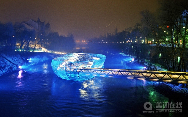 ![]() ![]() 地點(diǎn):格拉茲,奧地利 建筑設(shè)計(jì):Vito Acconci 完工時(shí)間:2003 由紐約當(dāng)代藝術(shù)建筑師Vito Acconci所設(shè)計(jì),是一座位于河中央的水上劇場(chǎng),它是格拉茲成為2003歐洲文化之都其中一個(gè)項(xiàng)目。格拉茲位于阿爾卑斯山南,是奧地利的第二大城市,建于15世紀(jì),部分地區(qū)至今仍保有中古世紀(jì)風(fēng)貌,并于1999年成為聯(lián)合國教科文組織指定之世界文化遺產(chǎn)城市。格拉茲的城市風(fēng)貌兼具了古典的優(yōu)雅和現(xiàn)代的時(shí)尚,也因此Acconci將這座既夢(mèng)幻又實(shí)際的前衛(wèi)建筑置入其中,不但不顯得突兀,還頗為貼切。