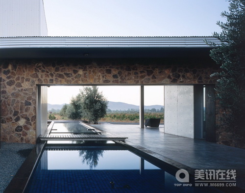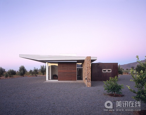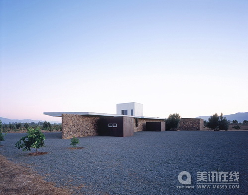 建筑設計:Sebastian Mariscal Studio 周圍環境 這個周末家庭住宅位于墨西哥下加利福尼亞的瓜達盧普山谷。這個山谷因生產葡萄酒而聞名,它的周圍是琥珀色的山脈。葡萄園和橄欖樹之間是綿延不斷的公路。房子被建于這些美麗的自然環境中,這些都同密集的城市生活形成了對比。 地點 這片莊園由七塊土地組成,這七塊土地都圍繞著葡萄園。每塊土地的入口道路都可進入到橄欖樹林中,在樹林中便可看到住宅和葡萄園。根據延伸的橄欖樹林,我們建造了一個長54米,高3米的石制幕墻。幕墻是房屋的主要軸線,它與葡萄園相平行,并垂直于成排的橄欖樹林。 空間安排 房屋是一種直線型的結構安排:公用空間(周圍環境),半公用環境(礫石天井),私人空間(客廳)和私密空間(臥室),這種空間結構安排創造了一種視覺上的連續性。自然環境定義了房屋的邊界,并且在白天和夜晚,以及在嚴寒和酷暑的氣候下,為住戶提供了一種變化的感官體驗。 住宅的各個空間通過石制幕墻以及屋頂聯系起來。在設計師第一次踏足這塊土地時,房屋屋頂的設計構想就應運而生,設計師希望給這里帶來一大片陰涼地帶。 屋子的入口處位于游泳池和橄欖樹林之間,露臺通過玻璃門自然的將客廳/用餐室/廚房結合了起來,游泳池為生活注入了活力,同時它也是一道美麗的風景,恬靜且清新。 門檻橫跨在一個木制的橋之上,這座橋延伸到一個窄窄的走廊之上,通向花園和臥室,這種設計構思來源于一個古老的傳說。房屋的下面鋪就的是礫石,這層礫石是房屋的基底,同時它也防止了灰塵侵入屋內。
