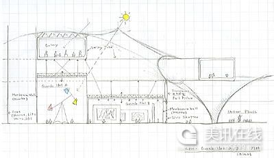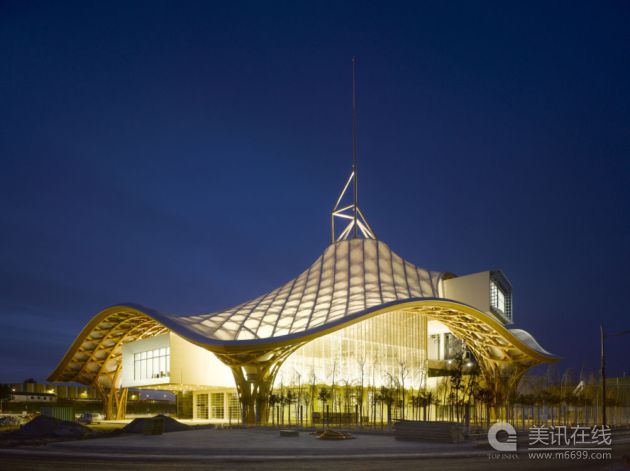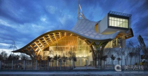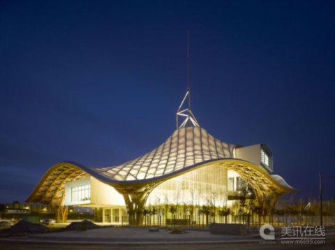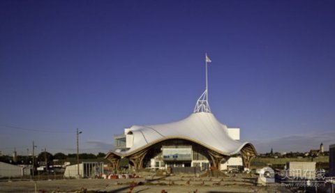 位于法國梅斯市(Metz)的蓬皮杜中心新館是一座夸張的拱形結構建筑,計劃在2010年5月開放。作為蓬皮杜中心第一座分館,2003年該項目宣布啟動。坂茂事務所和巴黎的Jean de Gastines事務所一起合作,在結束階段,Philip Gumuchdjian事務所也將加入進來。 這座巨大建筑的基本外形是一個六邊形,盡管抽象的屋頂遮蓋了其真實的外形。屋頂面積8000平方米,是坂茂根據中國草帽的樣子設計出來的。利用白色纖維玻璃薄膜,施以特氟綸(Telfon)涂層,彎曲的屋頂用復雜的六邊形網狀結構支撐,膠合板制作的木梁以2.9米分隔開。這種支撐性的網狀結構彈性很強,還有助于擴展屋頂區(qū)域。外部涂層不僅防水,還能控制溫度,保證內部藝術品得到保護。建筑的中部是一個77米高的尖頂,據說象征著蓬皮杜中心1977年在巴黎開放(園林景觀網)。 內部空間是三個永久性不規(guī)則展區(qū),以矩形(平行六面體)管子建造,伸出屋頂之外,將大塊觀景窗戶直接打開,可看到周圍的地標建筑。展區(qū)正中心成列了最重要的藝術品,天花板高度從5.7米伸展到18米。 除了展區(qū),這里還有一個144席的會堂和一座創(chuàng)意工作室(一座圓形建筑,可容納200人)以及一座70平方米的屋頂咖啡館。為了保證游客的舒適和安全,梅斯中心在施工中的檢驗是非常嚴格的,既檢測了對抗大風和暴雪的能力,也檢驗了步行區(qū)的適宜程度。 首任館長蓬杜·于丹(Pontus Hulten)說,“博物館不再是存放失去了社會功能的作品的祭壇,而是藝術家會見公眾,并激發(fā)公眾創(chuàng)意的地方。”