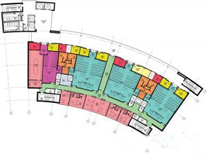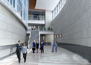 AECOM設計了159723平方英尺的美國馬里蘭地區法院大樓。新的設施包括9座法庭和監禁室、公設辯護律師辦公室以及馬里蘭總務部辦公室。新的法院在所處的新城中有著重要的地位,是馬里蘭大街南端終點,也是進入到羅克韋爾(Rockville)中部的門戶之一。通向廣場的階梯可引領人們進入到這座建筑,并與繁忙的街道隔離開來。 這座法院有著強烈的現代感,材料的運用考慮到了建筑的莊嚴外表和耐用性。單體的石質建筑上有多層玻璃窗,界定了建筑的公共區域。這些玻璃窗提供了面對羅克韋爾的視野,也引進了柔和的光線。 垂直的玻璃條帶將建筑分隔成三個主要部分,減少了單體建筑的沉重感。建筑的第一層是入口處、接待處和監禁室、專員套房以及行政辦公室;第二層是管理部門所在地;第三層幾乎都是公設辯護律師辦公室;第四層是三種標準法庭和稍大一點的交通法庭;第五層是三座法庭和兩間聽證室;第六層是兩座法庭、兩間聽證室和一座多功能室。三到六層都可以進行重新布局,最多可容納16座法庭。