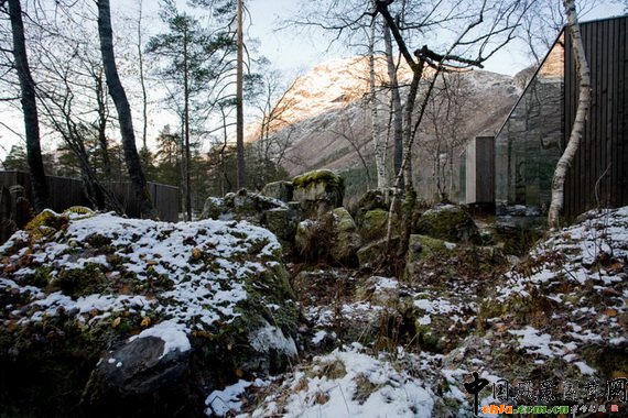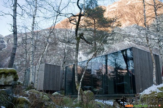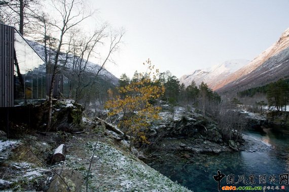 中國風景園林網訊 Gudbrandsjuvet的這家園林旅館占地800平方米,由當地居民Knut Slinning 發起,Jensen和Skodvin于2004年至2007年間設計,2008年建成。