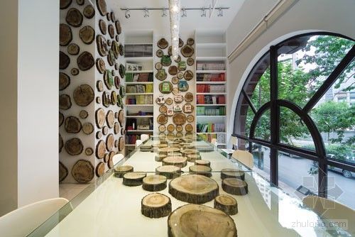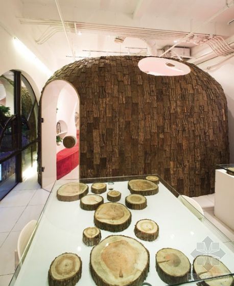 一層是主要的藏書空間,書柜排滿了一整面墻。迫慶一郎先生使用各種樹的板材做出寬度?深度?厚度各異的書柜,他們或挑出去或收進來形成一個立體的構造。其中又有用挖空的一段圓木做成的書柜,由此帶來新的“表情”。地板上投影出繁茂的樹葉,讓人真能感受到透過枝葉傾灑出的陽光一般。天花上等間距的排列著帶有枝杈的圓木,從街道上走過透過玻璃便可看見樹木一端年輪的模樣。在這個小小的空間,使用了至少十種不同的樹木,他們帶來了豐富的質感和機理,也為讀繪本的孩子們帶來了更多層次的體驗。 ![]() ![]() 一上二樓,便可看到由粗礫的樹皮覆蓋的半球形的活動空間。空間內部是純白的,好像雪屋一樣,頂上開有幾個不規則圓洞,似乎是森林里一處神奇的小宮殿一般。空間內地面做出高差,作為舞臺及觀眾席來使用。鋪上彩色地毯,孩子們便可以自在的躺在上面閱讀。這個部分和北京的蒲蒲蘭繪本館有了一定程度的呼應。