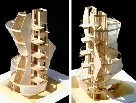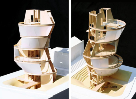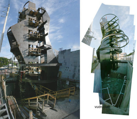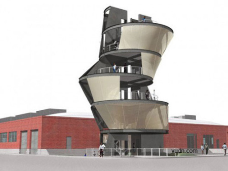 Eric Owen Moss建筑事務所設計了一個多媒體大廈,位于加利福尼亞州卡爾佛城經濟發展重點恢復區主入口處。該大廈的目的是將藝術和其他相關的當地以及路過該地旅途中的游客們進行分區。該經濟開發區已經吸引了那些經常路過該地的車內的觀眾。該地將由于建造一個新的輕軌路線而變得更加繁榮和受到行人的喜歡。該大廈由5個直徑在30英尺的圓形鋼圈組成。這些圓形鋼圈垂直放在12英尺的底層,相互直接用樓梯連接。各個吊環是錯開的,以體現不同的視角,不愧是史上最牛的建筑奇觀。