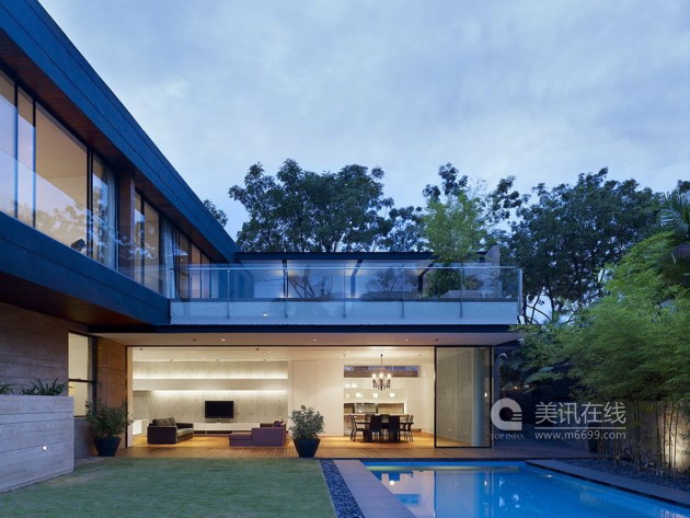 建筑設(shè)計(jì):Ong & Ong Pte Ltd 這個(gè)項(xiàng)目的客戶是一對(duì)夫婦,他們有三個(gè)小孩,其中兩個(gè)是雙胞胎。客戶的主要要求是不影響生活空間設(shè)計(jì)的同時(shí),保持盡可能多的室外空間。保證小孩子有足夠的室外和室內(nèi)玩耍空間也是非常重要的。建造一個(gè)寬闊的生活空間,并保證其和大型戶外空間的聯(lián)系是本次項(xiàng)目的主旨所在。 除了客戶的要求以外,還要保持室內(nèi)空間流暢的連通性和可持續(xù)性設(shè)計(jì)。 為了最大限度的利用場(chǎng)地空間,住宅被設(shè)計(jì)到場(chǎng)地的其中一個(gè)角落。從外面看,住宅的每個(gè)元素看起來(lái)都像是一個(gè)單一的部分,而實(shí)際上這些空間具有很強(qiáng)的練習(xí)性。 好客的入口設(shè)計(jì) 住宅的第二層主要是私人區(qū),因而懸于車道之上。這種懸垂的設(shè)計(jì),能讓住宅入口更有封閉感和安全感。這里使用的主要材料是鈦鋅合金,讓矩形體的表面發(fā)出一種黯淡的光澤。 為了營(yíng)造一個(gè)舒適的臥室環(huán)境,臥室的天花板設(shè)計(jì)的很低。住宅還有一個(gè)綠色屋頂,為住戶提供了更多的戶外空間,屋頂上還有一個(gè)燒烤點(diǎn),能俯瞰到下面的泳池。這個(gè)綠色屋頂是一個(gè)理想的娛樂(lè)區(qū)和花園區(qū)。 流暢的連通性 所有的社交活動(dòng)區(qū)都設(shè)計(jì)在住宅的一樓,而且一樓內(nèi)所有的空間都具有流暢的連通性。靈活的滑動(dòng)門正對(duì)著戶外花園。當(dāng)這些滑動(dòng)門滑入到墻壁之中的時(shí)候,花園和室內(nèi)就想一個(gè)是大整體了。 白色墻壁和混凝土柚木地板的組成也展現(xiàn)了各個(gè)空間的多樣性。步入住宅的時(shí)候,雕塑般的樓梯會(huì)馬上吸引到你的注意力,有機(jī)的外觀和住宅的的死板形成鮮明的對(duì)比。這個(gè)樓梯也是住宅上線兩層的連接樞紐,這樣當(dāng)你看到這個(gè)雕塑般的設(shè)計(jì)時(shí)候,自然想到人們?cè)谑覂?nèi)的流動(dòng)情況。 意想不到的娛樂(lè)空間 地下室是住宅的另一個(gè)主要元素。不過(guò),和住宅上兩層不同的是,它并沒(méi)有任何外觀風(fēng)格來(lái)暗示內(nèi)部的設(shè)計(jì)。一般來(lái)說(shuō),地下室都是座位儲(chǔ)藏室使用,而非社交區(qū)。不過(guò),在這里可就不同了,由于地下室的自然采光效果不錯(cuò),因此把它作為娛樂(lè)場(chǎng)地設(shè)計(jì)是一個(gè)非常有創(chuàng)意的想法。地下室內(nèi)有吧臺(tái)、臺(tái)球桌、書房和電影室。 可持續(xù)性設(shè)計(jì) 從項(xiàng)目一開(kāi)始,這個(gè)住宅的設(shè)計(jì)就包括了可持續(xù)性設(shè)計(jì)。住宅的朝向就考慮了此地的主風(fēng)向,讓室內(nèi)擁有更好的通風(fēng)環(huán)境。大型開(kāi)口設(shè)計(jì)也保證了室內(nèi)的通風(fēng)采光效果。高熱質(zhì)量混凝土和水磨石能幫助住宅降溫。當(dāng)?shù)氐淖匀昏帜静粌H環(huán)保,還減少運(yùn)輸費(fèi)用。此外,木材都涂上環(huán)保的水基防腐劑。地下室有三個(gè)天窗。二樓還采用了遮陽(yáng)設(shè)計(jì),減少住宅獲得的太陽(yáng)熱能。泳池附近種植了很多當(dāng)?shù)卣谑a樹(shù)木。