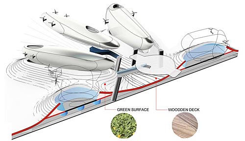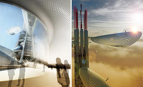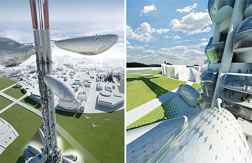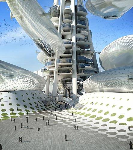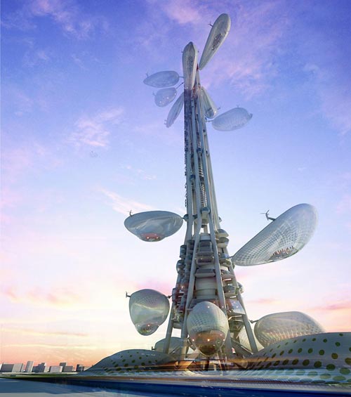 這是臺(tái)灣塔概念設(shè)計(jì)競(jìng)賽的一等獎(jiǎng),出自由羅馬尼亞的upgrade.工作室和DSBA以及美國(guó)的Mihai Carciun三方組成的聯(lián)合團(tuán)隊(duì)。 “漂浮瞭望臺(tái)”方案概念由upgrade.工作室提出。以植物生長(zhǎng)的方式,將多個(gè)“豆莢”圍繞塔身主體上下浮動(dòng),達(dá)到流動(dòng)觀測(cè)的目的。這座未來(lái)主義風(fēng)格的巨塔將包含博物館、信息中心、辦公室、會(huì)議中心和餐廳等功能,每個(gè)懸掛的“豆莢”可容納50-80人,由控制塔中的強(qiáng)電磁場(chǎng)軌道上下滑動(dòng)。