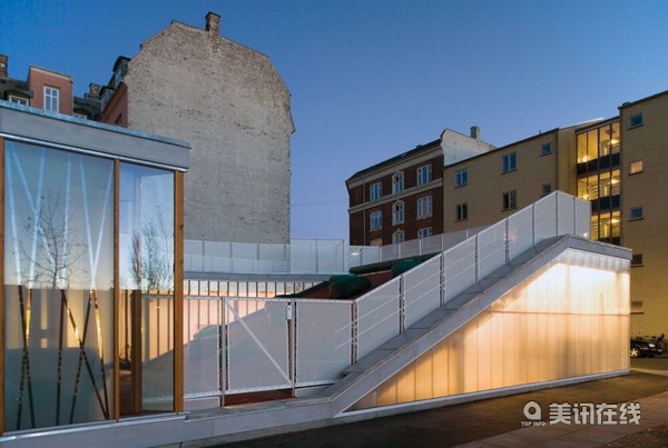 Dorte Mandrup Arkitekter 按照委托方日托幼兒中心的要求,在設計中最大限度地連接了室外地面和屋頂平面,以確保項目獲得最佳日照。項目由斜坡和屋頂兩個平面構成并一直延伸至建筑的邊界上。斜坡從一樓至屋頂形成山坡狀表面,斜坡的設計按照夏日抬眼由東北至西北的方向形成,如此可以為斜坡和庭院由南至西提供最佳日照。沿著斜坡往下是一個設有許多柱子的空間,陰冷潮濕的天氣里,孩子們就可以在這里玩耍,蕩秋千或者做其他的活動。屋頂地面采用鮮艷熱烈的橘紅色,是一個理想而節約空間的室外場所。屋頂設有兩個進光孔,以確保一層其他房間的光照效果。