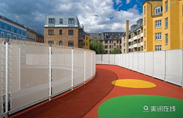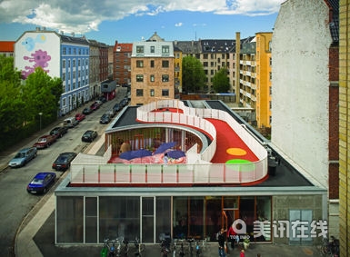 Dorte Mandrup Arkitekter 按照委托方日托幼兒中心的要求,在設(shè)計(jì)中最大限度地連接了室外地面和屋頂平面,以確保項(xiàng)目獲得最佳日照。項(xiàng)目由斜坡和屋頂兩個(gè)平面構(gòu)成并一直延伸至建筑的邊界上。斜坡從一樓至屋頂形成山坡狀表面,斜坡的設(shè)計(jì)按照夏日抬眼由東北至西北的方向形成,如此可以為斜坡和庭院由南至西提供最佳日照。沿著斜坡往下是一個(gè)設(shè)有許多柱子的空間,陰冷潮濕的天氣里,孩子們就可以在這里玩耍,蕩秋千或者做其他的活動(dòng)。屋頂?shù)孛娌捎悯r艷熱烈的橘紅色,是一個(gè)理想而節(jié)約空間的室外場(chǎng)所。屋頂設(shè)有兩個(gè)進(jìn)光孔,以確保一層其他房間的光照效果。