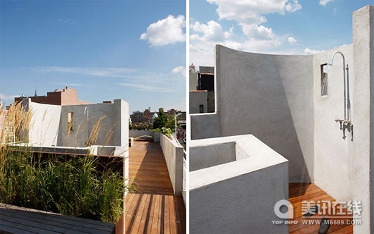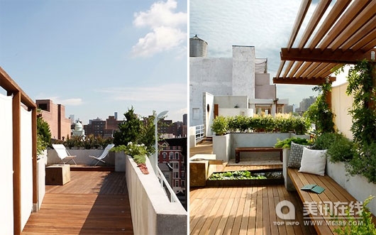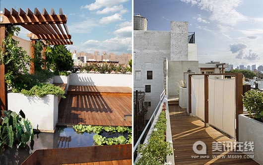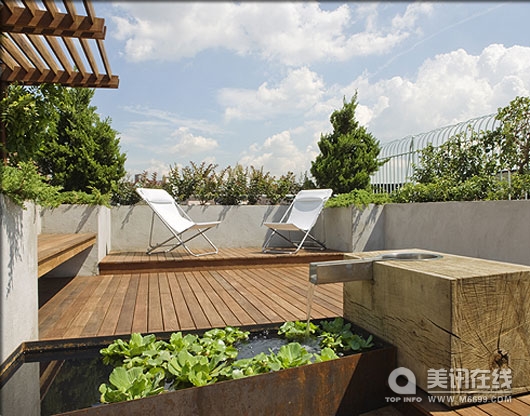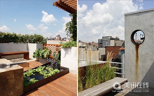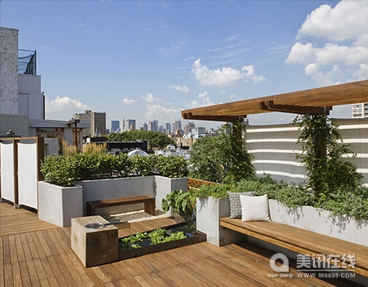 Pulltab設計公司最近在曼哈頓西區完成了一個現代屋頂花園的設計。該花園一方面美感十足,另一方面也為花園物主提供了足夠的隱私。屋頂的中央有一大塊的白色橡塊,橡木是從賓夕法尼亞州的木材廠精選出來的。為了增加一處水景,還特別在這個白色橡木塊中定作了一個帶水噴頭的不銹鋼水盆。橡木塊可充當座椅使用,而水盆則是噴泉。這里是城市休息的絕佳之地,如果你住在城市公寓里,又想擁有一個漂亮的花園,那么這也許就是你不錯的選擇。