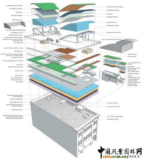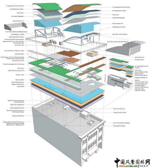 該項目位于美國景觀設計師協會在華盛頓的辦公樓樓頂,面積3000平方英尺。項目旨在將原屋頂改造成具有教育價值的綠色屋頂典范。