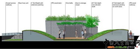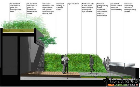 南北的兩個大土堆抬高了游客的視線,使城市前景更為突出,也使人們關注到周圍的天際線。土堆由輕質材料支撐,但兩個土堆的結構也有所不同:一個適合低矮植物生長,他們要求的土壤深度比較淺;一個需要有深厚的土壤做基底,當然,其上的植物長的也會比較高。這些高一點的植物像一道矮墻,正好可以被旁邊道路上行人看到,“矮墻”告訴行人:這是綠色屋頂。