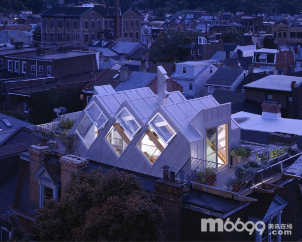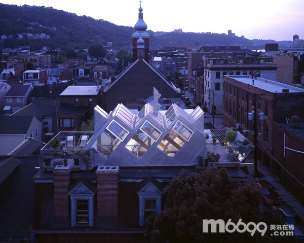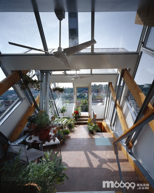 原來屋頂上是匹茲堡最早的一個溫室,靈感來自科德角的“新煉金術”生態學研究中心早期修建的太陽溫室,使用太陽能溫室原則。因此建筑內終年都可以種植植物,為樓下住宅提供新鮮空氣、余熱和植物香味。不過由于年久失修,這座溫室要被替換掉。新建筑的結構和俄國套娃的理念相同,就是“結構中的結構”。主要的承重結構是外露的花旗結構,而最外圍結構是標準木結構,并結合玻璃和不銹鋼。新結構使用了鋁板、隔熱玻璃和不銹鋼板,并采用了和原來太陽溫室相同的配置。