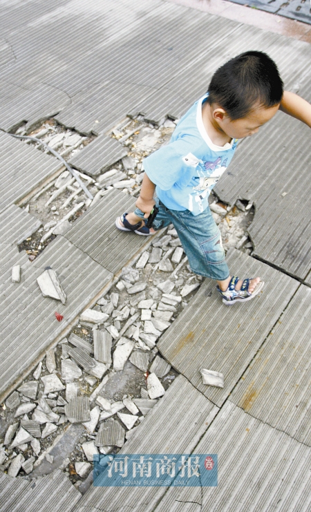 家長總擔心損壞的路面把孩子絆倒 商報記者 田仲煜/攝 有網(wǎng)友發(fā)帖稱,昔日景觀大道中州大道上的人行道成了“路脆脆”,早在2007年,鄭州市中州大道兩側人行道板接連出現(xiàn)破損、斷裂現(xiàn)象。記者調查發(fā)現(xiàn),中州大道兩側約1公里長人行道板大坑套小洞。 ■ 現(xiàn)場 1公里長的人行道“千瘡百孔” “中州大道兩側的人行道板損壞了兩年,怎么沒人管?”昨日,鄭州市民李先生來電反映,稱中州大道兩側人行道板損壞嚴重,部分路面斷裂,形成若干“窟窿”,遇到下雨就積水,不少行人被“咬”。 昨日上午,記者沿中州大道從鄭汴路與中州大道交叉口向南步行至貨站街,發(fā)現(xiàn)機動車道西半幅約1公里長的人行道出現(xiàn)不同程度的破損,有些石板縫隙間已經(jīng)雜草叢生。 據(jù)附近建材市場商戶劉先生稱,人行道上的石板是中州大道修路時鋪蓋的,距今已有兩三年時間。順著劉先生手指方向,路面鋪設的長方形石板已經(jīng)破損一半以上,一些碎石散落在地面。從石板破損處看,人行道鋪設的石板分上下兩層,中間中空。“路面里面是空的,沒鋼筋,有重物壓過去,肯定會爛。”劉先生說。 大河網(wǎng)友“坐看云起時”發(fā)帖,稱中州大道為“路脆脆”。他一周前去鄭州世紀歡樂院途經(jīng)中州大道,見一個小孩被人行道破損路面絆倒,于是有感而發(fā)帖。 ■ 疑問 是路太“脆弱”,還是車太“沉重” 網(wǎng)友“請相信我一次”跟帖說,他一年前就知道中州大道有部分人行道破損嚴重,但沒見有人修過。“那里建了那么多建材市場,拉貨的三輪車從人行道上過往,路不壞才怪呢。” 在建材城附近開三輪車的牛師傅說,路面之所以出現(xiàn)破損,主要原因是進出建材市場的大車碾軋所致。 對于牛師傅的說法,一些司機并不認同。貨車司機李師傅稱,他們很少把車開到人行道上,路面損壞主要是大量拉貨三輪車碾軋的結果。 到底誰軋壞了人行道板,建材城商戶吳先生認為,貨車、拉貨三輪、載人三輪都有一點責任,但最主要的責任在于道路施工方和規(guī)劃部門。“這里有建材市場,使用‘空心石板’做建筑材料合適嗎?”吳先生說。 ■ 追蹤 說起實質問題,相關部門“踢起皮球” 昨天下午,記者聯(lián)系上了中州大道改造指揮部。一名男性工作人員說,損壞的石板只在中州大道鋪設了小部分,大部分人行道采用的是其他石板。人行道板毀壞是施工不合格還是道板質量太差?面對記者提問,該工作人員稱,不知道具體原因。“現(xiàn)在這個路段已經(jīng)移交給鄭州市環(huán)城快速路管理處。” 隨后,記者致電鄭州市環(huán)城快速路管理處,一位女工作人員說,他們只負責中州大道快車道與慢車道,人行道沒有移交,并提供了中州大道綜合指揮處的電話,讓記者詢問。記者再次致電中州大道改造指揮部,一男工作人員告訴記者,對于環(huán)快的說法自己并不清楚,需要請示領導。“環(huán)快是在推卸責任。”該工作人員表示。