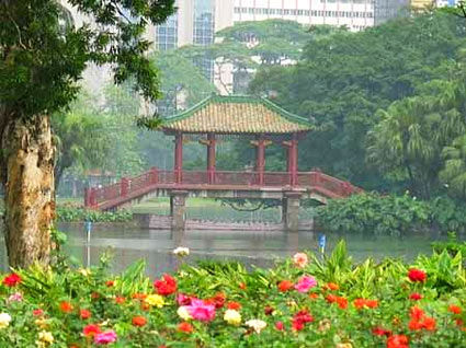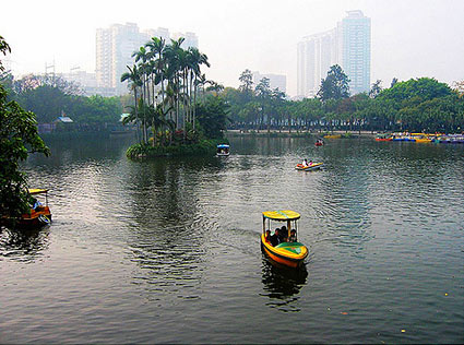流花湖景觀迷人 流花湖公園占地54.43公頃,其中湖水面積占60%,綠化占陸地面積88%。流花湖公園現址相傳是晉代芝蘭湖,后成為菜田。1958年市政府為疏導街道水患,組織全市人民義務勞動,建成流花湖等四個人工湖,后辟為公園,除原有蓄水防洪功能外,還是集游覽、娛樂、休憩功能為一體的大型綜合性公園。公園以棕櫚植物、榕屬植物、開花灌木及開闊的草坪、湖面與輕巧通透的嶺南建(構)筑物相互配合,形成具有強烈南亞熱帶特色的自然風光。 荔灣湖公園:荔枝灣畔西關情 撐艇仔、抓魚蝦、荷香襲襲、湖邊送爽