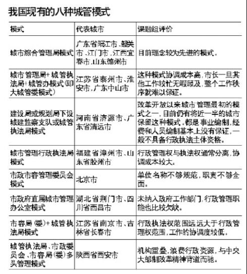 名詞解釋 大城管:由住房和城鄉建設部負責指導,在全國各地級市(或富裕的縣級市)統一建立城市綜合管理委員會,職能覆蓋給水、電力、通信、供熱、交通運輸、供氣、垃圾收運處理、排水、園林綠化、應急食品等城市基礎功能和城市公共空間,由市長任“一把手”,統籌各職能部門,實現城管的管理權和執行權統一。 進入新世紀,我國許多地方開始推行“大城管”機制。江蘇淮安市的“大城管委”模式、山東德州市和江西宜春市的“大城管局”模式成效顯著。近日,由住房和城鄉建設部立項的《中國城市管理體制及其運行機制研究》課題組在借鑒這兩種模式的基礎上,提出“大城管”概念:成立城市管理委員會,由市長任“一把手”,統籌各職能部門,實現城管的管理權和執行權統一。 課題組共同主持人、全國城管執法局長聯席會議執行會長兼秘書長羅亞蒙在接受南方都市報采訪時表示,與目前的城管相比,“大城管”不會增加現有編制,課題組專家希望以正在開展的全國市、縣政府機構改革為契機,整合城市管理系統各職能部門,推行“大城管”模式。 兩大試點: 成效顯著但各有弊端 2005·德州模式:“大城管局”管天管地管空氣 山東德州市城市管理行政執法局局長趙春雨告訴本報記者,德州市從2005年開始推行“大城管局”模式,其最大的特點是管理、執法一體化。“管理和執法如分離,就會造成部門之間的交叉、扯皮,影響工作效率。” 所謂“大城管局”模式,是指城管局的職權很大,真正做到“管天管地管空氣”。如德州把所有與城市管理有關的問題都納入一家來管理,包括環境衛生、園林綠化、城市防汛、市容市貌、城市景區、供水、供氣、供熱等,都納入城市管理的范疇。同樣試水該模式的,還有江西宜春市。 2007·淮安模式:“大城管委”運行一年投訴減九成 今年,江蘇淮安市一女攤販在繁華街道擺地攤,影響交通和市容。淮安市城管局的執法人員勸其搬離時,攤販與城管隊員發生爭執。淮安市城管局調查發現,這名攤販家庭困難,丈夫去世,孩子在念大學。經市城管委和其他部門協調,將該攤販安排到其他一個區域,紅火的生意讓她對城管的工作十分滿意。 “其實這都歸功于市城管委員會的統籌協調能力。”淮安市城市管理局機關黨委書記仲偉銀告訴南方都市報記者,淮安市在2007年開始推行“大城管委”,成立了由市長任主任、分管城建的副市長任副主任的城市管理委員會,下面設立辦公室,由城管局局長任辦公室主任,委員會下面相關的區和職能部門的領導任成員。城管委員會涉及到市政、園林、市容、環衛、城市交通等部門。 仲偉銀說,要是在兩年前,城管只能將該攤販清走,現在推行“大城管委”模式后,由城管委員會來統籌和協調其他部門,這樣處理起來可達到“雙贏”。 仲偉銀介紹,推行“大城管”使城管委員會有了管理權,可以針對新的問題制定法規制度,如優先為失業人員、零就業家庭和進城農民免費提供由市政府和企業贊助提供的便民措施和劃定的崗位,大大緩和了城管和攤販的矛盾。 據統計,在2001年淮安市城管局剛成立時的兩年內,淮安城管的投訴熱線每年接到群眾投訴2000多件;“大城管委”機制運行后的2008年,接投訴不到200件,且大部分是建議性的,言辭不像過去那么激烈。2008年,國家衛生城檢查組到淮安來檢查,隨機抽查老百姓對城管的滿意率達97%。 兩種模式各有弊端:一種增加成本 一種依賴個人 課題組總結,我國目前共有8種城市管理模式,多頭管理、五花八門。其中,淮安的“大城管委”、德州和宜春的“大城管局”是各地改革試點的典型,取得了顯著成效。 “但兩種模式各有弊端。”羅亞蒙表示,淮安“大城管委”背后,其城管局的權力太小,只涉及到市容、環衛等,如市政、園林都不在其職權范圍,這就導致很多問題都需城管委來統籌,協調成本增加。該市市長、主管副市長、以及各部門的主要負責人每個月都要召開月度城市管理點評會。 “德州和宜春推行的‘大城管局’模式目前管理很好,主要是領導個人的魅力和能力,如果換一任領導,可能就沒有這么強的領導能力了。”羅亞蒙說。 面向全國: 各地憂部門利益阻礙職權整合 日前,由住房和城鄉建設部立項的《中國城市管理體制及其運行機制研究》課題組提出“大城管”模式,明確了“大城管局”的職能,即城市綜合管理,包括給水、電力、通信、供熱、交通運輸、供氣、垃圾收運處理、排水、園林綠化、應急食品等城市基礎功能和城市公共空間。還提出城市管理工作應由住房和城鄉建設部負責指導,各城市統一建立城市綜合管理指揮中心(類似于淮安市城市管理委員會)。 此外,課題組還提出一個硬性規定:城市綜合管理指揮中心的“一把手”必須由當地行政首長來兼任,副職都不行。 羅亞蒙認為,“大城管”模式是使城管部門同時具有管理權和執法權,實現“前置管理”,就是不把關注點和重點放在行政處罰上,而是放在管理和服務上。從體制上確立“大城管”模式。 來自湖北、廣東、福建等省份多個地級市的城管局負責人都對推行“大城管”表示擔憂,因為以往的城市管理體制并不統一,每個部門都有各自的利益,現在對各部門的職權進行統籌和整合,擔心會有阻力。 羅亞蒙認為,推行“大城管”的阻力不是部門之間的阻力,如果當地(主要是市一級)的一把手有