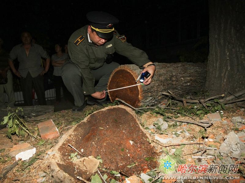 2日晚,在哈爾濱市南崗區耀景街41號居民小區院內,兩棵胸徑50厘米的百年老榆樹被人擅自砍伐。據小區居民介紹,十多個不明身份的人進入小區,不顧居民反對,執意伐樹。在裝車拉運時,南崗區行政執法局夜勤科的執法人員趕到現場,將車輛滯留。貨車司機見執法人員趕到,逃離現場。伐樹者稱,伐樹是受雇于人,但沒有說出雇傭方。經園林部門工作人員調查,伐樹并未取得相關審批手續,屬于擅自砍伐。執法人員準備待車主前來取車時,按每棵樹4.5萬元的價格進行處罰。目前,相關責任人正在進一步調查中。