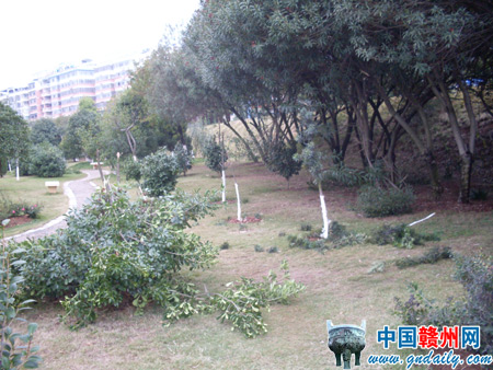12月17日凌晨,贛州市章江北大道客家風情園附近綠地遭受人為破壞,一些夾桃和桂花樹、海桐樹共24株被折斷。園林部門呼吁,廣大市民要愛護樹。 杜楚芬 攝