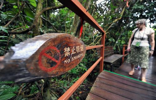 海南省保亭縣呀諾達熱帶雨林景區采取全景區禁煙措施保護生態環境,禁止吸煙的提示牌隨處可見(1月9日攝)。新華社記者 郭程 攝