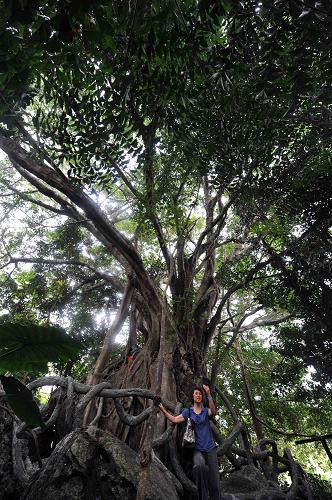 游客在海南省保亭縣呀諾達熱帶雨林景區內的一棵榕樹下留影(1月9日攝)。新華社記者 郭程 攝