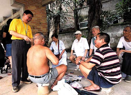 公園新規(guī),禁止打赤膊。圖為在荔灣湖公園,老年義工勸赤膊老人穿上衣服 李小萌 攝