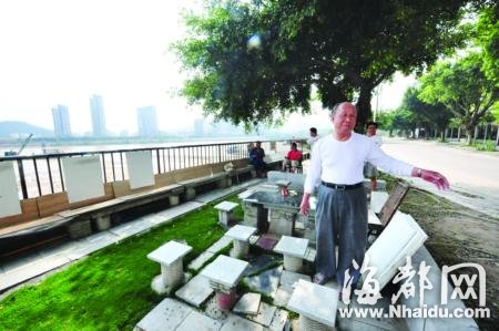 老人在閩江畔自建小公園