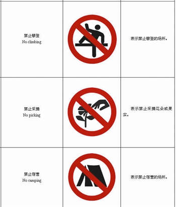 部分風景園林標志 由天津師范大學教授、中國標志設計研究中心主任牟躍領銜設計的新中國首批統一的風景園林標志,現已通過專家評審,年底前將在全國名勝古跡、自然保護區、公園、動物園等所有風景園林區陸續上崗。屆時,不同國籍、民族、文化程度的游客都能從這些簡潔生動的圖形標志中獲取信息,使游覽更加安全便捷。 據介紹,新中國成立以來,我國風景園林景區的服務標志、安全標志尚沒有統一標準,各式各樣的圖形紛繁復雜、差異頗大,給游人造成了一定困擾。隨著公眾休閑娛樂需求的提升,迫切需要建立統一規范的風景園林標志標準,更好地為游客提供服務。 即將在全國實施的《風景園林標志》由住房和城鄉建設部負責管理,共分為專業、服務、安全三大類共83個標志,除“出入口”、“停車場”等通用標志外,新設計和修改的有41個,約占50%。例如在安全類標志中新增了“當心毒性魚”、“當心毒性植物”、“當心礁石”等。同時,對先前各地雖普遍使用,但一般以文字為主的“禁止采摘”、“禁止踩踏”等標志進行了修改,重新繪制了令游客一目了然的圖形標志。 據介紹,本次制定《風景園林標志》全國標準過程中,專家團隊充分借鑒了意大利羅馬、日本箱根等國際知名景區的成功經驗,并結合我國特點反復推敲,處處彰顯了人性化與國際化的理念。如在服務類標志中新增了“成人帶領”、“人行步道”等標志;在專業類標志中,把原來在某些景區使用的“沼澤”、“森林”,修改為“城市濕地公園”和“林地”,并新增了“候鳥留憩地”、“古樹名木”等標志。 “使用統一的風景園林標志,能使每個到陌生風景區和城市園林、公園的游人,即便是國際友人、少數民族同胞、聾啞人,也能有效跨越語言障礙,很容易地識別各種公共設施、設備、場所,從而安全、快速、無障礙地享受服務。”牟躍教授介紹說。