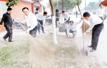 宿遷市直機關工作人員在認真清理打掃路邊垃圾。