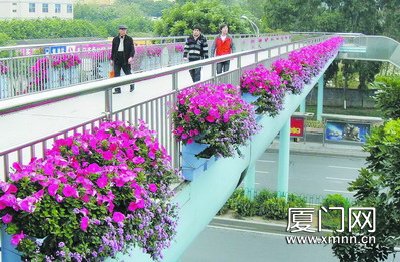 完成垂直綠化改造的人行天橋像座花廊。