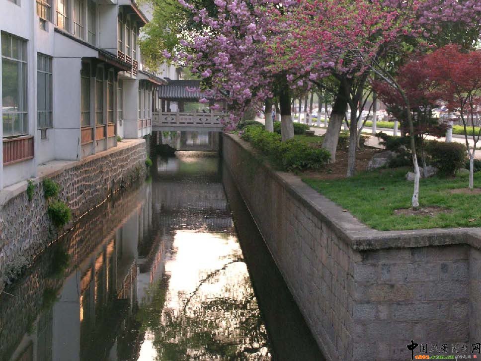 利用古城內縱橫交錯長達35公里的河道,在拓寬道路的同時,建設形式各異的濱河綠地,如在道前街、臨頓路、干將路、學士街等濱河綠地建卵石鋪地、亭廊棚架小品,有“人在花間走,柳在岸上行”、“卵石鋪花叢,隔河看墻景”的韻味。尤其是溝通工業園區和新區的主干道干將路改建后,呈“兩路兩綠夾一河”的獨特形式,大量的花灌、色塊和具有盆景特色的景觀樹、造型樹,獨具特色,美化了城市景觀。