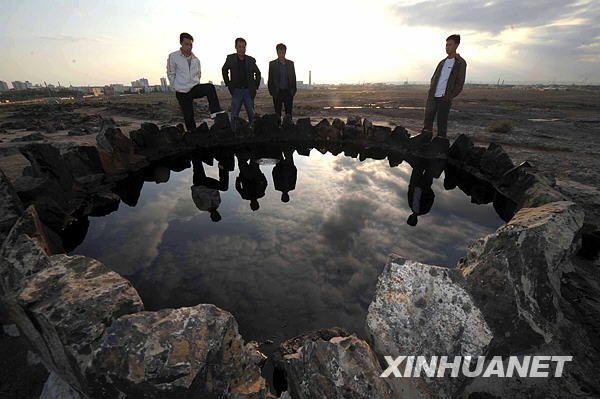 游客在新疆克拉瑪依市黑油山一處油池旁參觀(2008年9月21日攝)。新華社記者趙戈攝