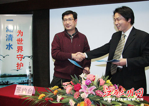 鄱陽湖國家濕地公園管委會主任胡凌鋒(右)與江西省海外旅游總公司副總經理萬愷(左)簽約旅游發(fā)展合作協議。(江西文明網 記者 王東 攝)