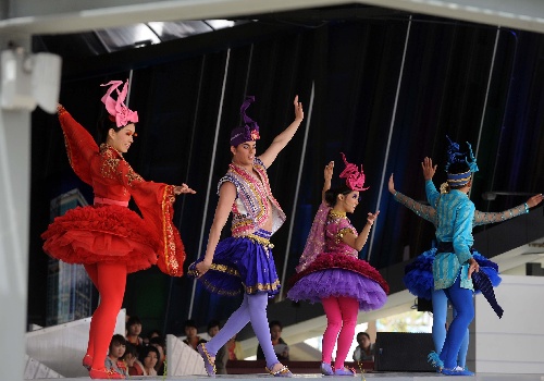 上海,2010年4月27日 世博場館完善“細節”等待開園 4月27日,新加坡館的演藝人員在進行排練。 當日,上海世博園區各場館針對六場試運行的情況,對場館設施和接待服務的細節方面做進一步整改、完善,少量場館的外裝飾工程也基本結束,等待5月1日世博園開園儀式到來。 新華社記者王頌攝