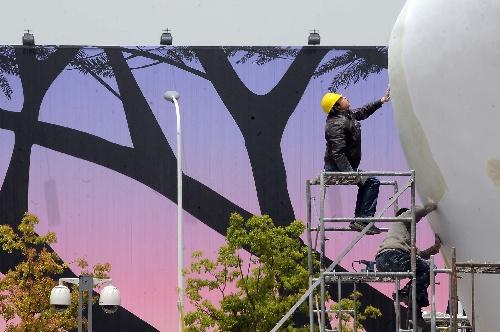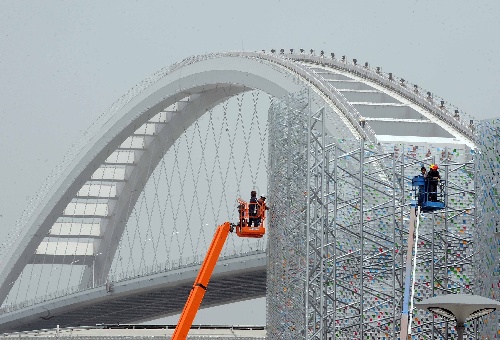 上海,2010年4月27日 世博場館完善“細節”等待開園 4月27日,兩名工人在刷洗埃及館的墻體。 當日,上海世博園區各場館針對六場試運行的情況,對場館設施和接待服務的細節方面做進一步整改、完善,少量場館的外裝飾工程也基本結束,等待5月1日世博園開園儀式到來。 新華社記者王頌攝