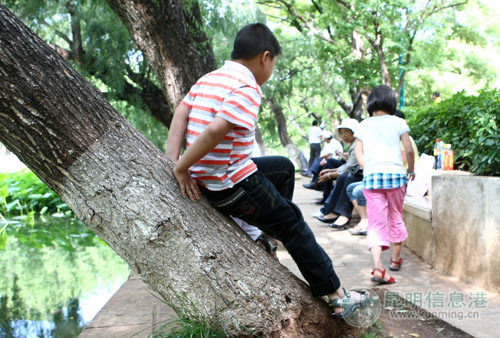 在翠湖公園一位游小朋友爬上公園綠化樹,既不安全又不文雅。記者王俊星攝
