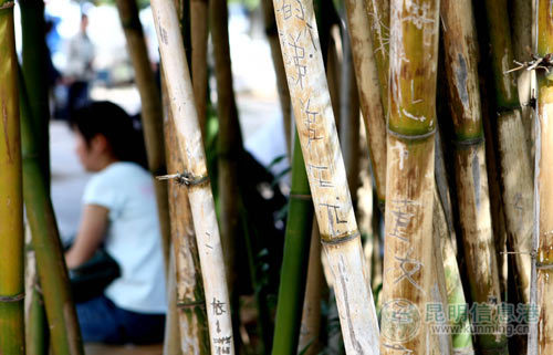 翠湖里的綠化植物上被游客刻滿了字。記者王俊星攝