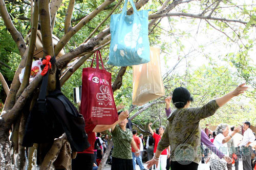 翠湖里的綠化樹上掛滿了包,綠化植物不堪重負(fù)。記者王俊星攝