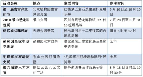 據了解,18日開幕式當天,頤和園將上演一場京味兒十足的“皇家秀”——皇家宮廷舞、民樂演奏、名園景觀元素服飾展示、京劇名角粉墨登場。與此同時,作為“6+1”活動中的“1”,上海世博園也將開展為期一周的“收藏精彩世博,相約北京公園”活動,向參觀世博會北京館的游客贈送北京歷史名園套票和北京公園節游園手冊,宣傳北京公園文化。北京公園節部分活動摘選
