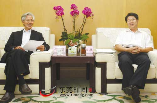 ■昨日,劉志庚會(huì)見何鏡堂,并聽取東莞市地名文化公園項(xiàng)目情況匯報(bào) 本報(bào)記者 程永強(qiáng) 攝