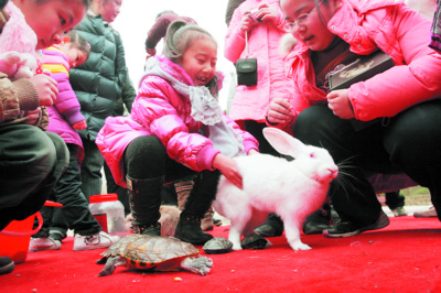 比賽現(xiàn)場,大家先后數(shù)次努力讓兔子和烏龜在起點(diǎn)集合,然而由于兔子太活潑到處亂跑、烏龜怕冷一動(dòng)不動(dòng),根本不按照既定的路線比賽,把參賽的主人們忙了個(gè)夠嗆,現(xiàn)場是歡笑連連。第三次組織比賽時(shí),灰兔子“寶寶”在主人劉新的一聲令下,蹭地一下就跳到了終點(diǎn),甩下了其他的兔子和烏龜們,最終贏得了比賽。“事實(shí)證明,兔子還是能跑得贏烏龜?shù)模 眲⑿率指吲d。