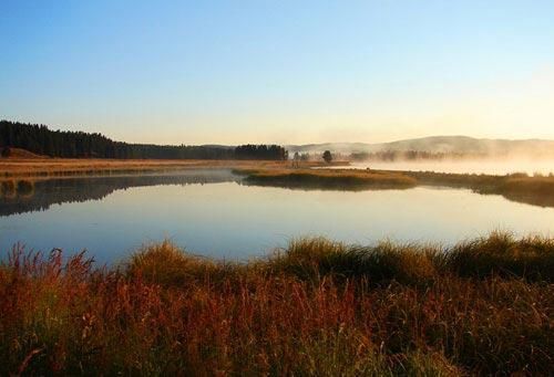 早上六點起床,徒步到黃石湖邊的一個小半島上看日出。日出時間是6:40。這是我看過的最美的一次日出。黃石湖面水氣蒸騰,原始的湖岸上枯樹倒地,巨石嶙峋,波浪拍打出有規(guī)律的湖岸砂石層。太陽出來后,地面的水氣慢慢化作一層薄霧,環(huán)繞在湖濱山丘和草地上。美的讓我心痛。不知道什么時候,我還有機會看到這樣的美景。