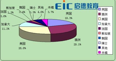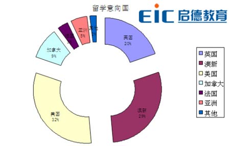 這份針對全國10個城市,5000多名學生及家長的調研統計數據顯示,國內大中學生最中意的留學熱點國家分別為:美國、澳大利亞、英國、加拿大、法國、新加坡、德國、荷蘭、韓國……。“前三甲”的比例是:美國32%、澳大利亞和新西蘭29%、英國20%。