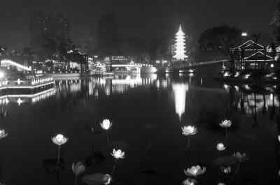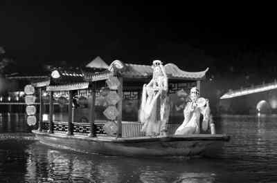 劃過一個回廊,眼前豁然開朗。終于來到了白鷺洲“風情萬種”大舞臺。這里每晚都有大型水上實景演出《夜泊秦淮》,六朝古都,十代都會,2500年的燦爛與滄桑,在這舞臺上流轉著。《梅花三弄》、《桃團扇》、《香君撕扇》等輕歌曼舞,也在湖光山色中柔美地展開。河面,綻開點點荷花彩燈;空中,縈繞裊裊秦淮古樂。好一個槳聲燈影中朦朧的人間仙境。